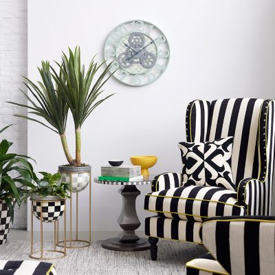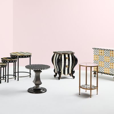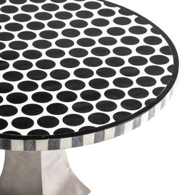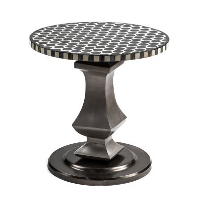 The Black Spot On Accent Table is aptly named because it’s the perfect spot for a small lamp or parking your favorite book. Featuring bold black dots on its wood and resin top, trimmed with striped bone inlay, it sits on an iron pedestal frame.