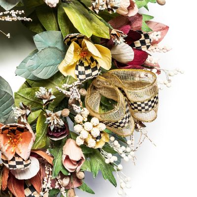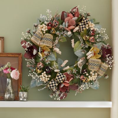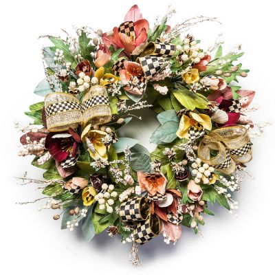 Spring ahead with this wreath, featuring everlasting pastel-colored tulips with touches of Courtly Check® along with paper leaves, seedpods, and natural branches. It’s embellished with Courtly Check and Courtly Check Sinamay Ribbon. Hang this in a protected location.