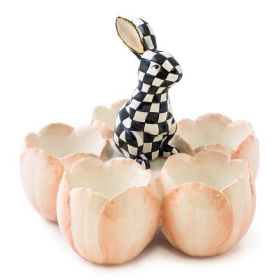 Spring ahead with this ceramic candy dish, featuring a hand-painted, check bunny set in the center of five tulip-shaped cups. It’s food safe, so you can add jelly beans or colored Easter eggs to each cup.