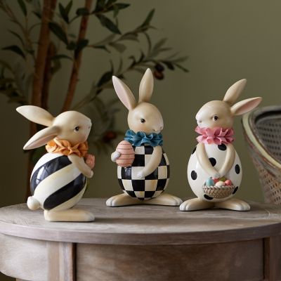 Spring ahead with this adorable trio of hand-painted rabbits. Each one is a unique design, with egg-shaped bodies embellished with checks, stripes, or dots, and finished with grosgrain ribbon collars.