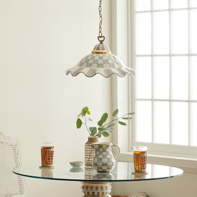 The silhouette of our Sterling Check® Fluted Hanging Lamp casts an illuminating glow wherever it’s placed. Hand-painted with color-dragged grey checks by our master Aurora artisans, each piece is unique, simultaneously timeless and modern. Other features include embellishments of gold lustre and a brass hanging chain.