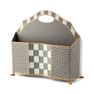 The Sterling Check® Magazine Holder is a fabulous and functional piece, made of iron and featuring a hand-painted design of Sterling Checks, Stripes, and dots, edged with golden trim.