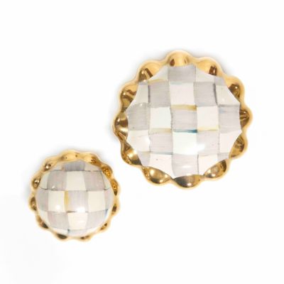 Hand-painted onto a petite scalloped silhouette of glazed ceramic, the Gold Sterling Check Petite Four Knob features our color-dragged grey and white checks, framed with gold lustre. Our Petit Four Round Knobs mix and match wonderfully with each other and other knob patterns to brighten any space with a style all your own.