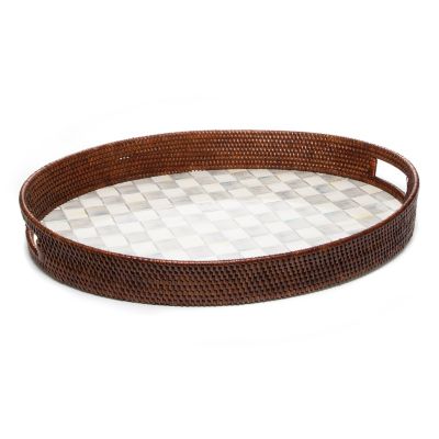 An ample tray for breakfast in bed, a garden party or your personal carry-out, the Sterling Check Rattan & Enamel Party Tray begs no occasion, but suits casual and formal fêtes alike. As handy as it is handsome, this entertaining tray mixes woven natural rattan against our hand-painted Sterling Checks.