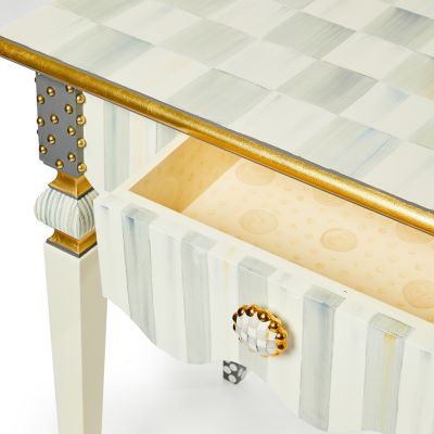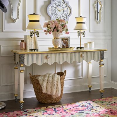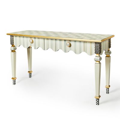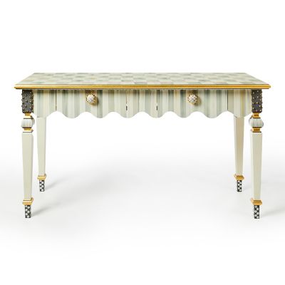 Made start to finish in Aurora, New York, the beautifully proportioned Sterling Stripe® Console Table features Sterling Check and Stripe on a silhouette that includes a graceful scalloped-edge apron, corner blocks studded with gold beads, and carved legs, all hand-painted by our artisans. The drawers feature handcrafted Sterling Check ceramic knobs.