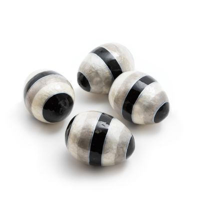 Our set of four Sterling Stripe Eggs makes a statement for spring. Made of capiz, they’re decorated with hand-painted black, grey, and ivory stripes and presented in a mesh crate, topped with a raffia bow. Display them on their own or with our other capiz eggs.