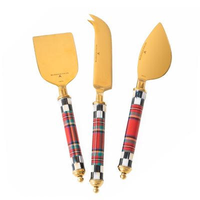 Slice and serve hard cheese with ease with this three-piece cheese knife set. Made of stainless steel with a golden finish, the handles have a clear enameled coating bedecked in red tartan.