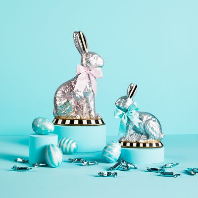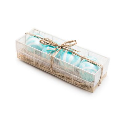 Our set of four Sweet Shop Aqua Eggs make a statement for spring. Made of capiz, they’re decorated with hand-painted aqua and white patterns and presented in a mesh crate, topped with a raffia bow. Display them on their own or with our other capiz eggs.