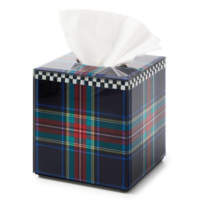 Dress up a household staple with this boutique tissue box cover, featuring black tartan printed on the top and sides and trimmed with Courtly Check®.