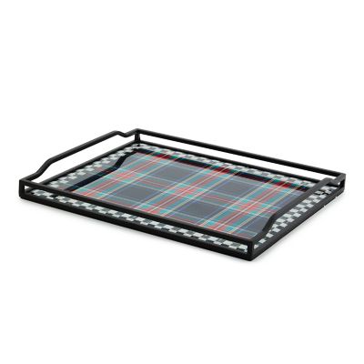 Make any room more stylish with this tray, featuring black tartan and checks printed under glass and trimmed with powder-coated metal rim and handles.