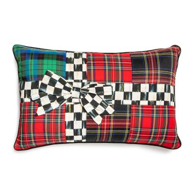 This holiday pillow features a patchwork of tartan fabrics, embellished with a Courtly Check® sash and bow, and trimmed with black velvet piping.