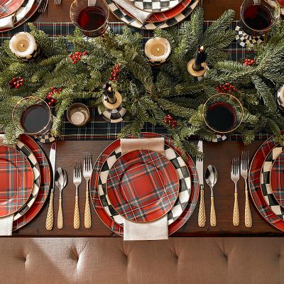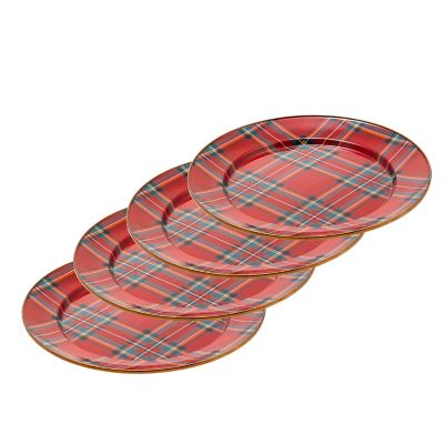 Set a place at the table for this set of four red tartan enamel chargers. They’re made of heavy-gauge steel and rimmed in bronzed stainless steel.