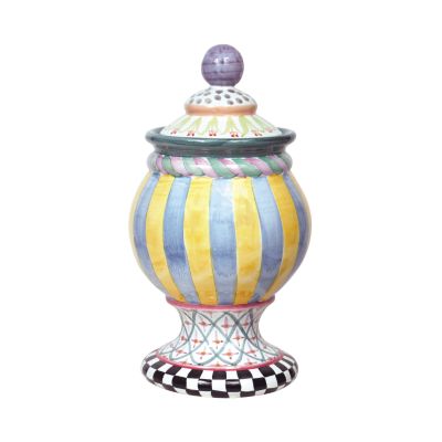Make a countertop statement with the bold, vibrant patterns and stately shape of the Odd Fellows Globe Canister. This charming piece features a medley of patterns patched together for a delightfully mix-matched version of signature MacKenzie-Childs designs to be the center of attention. Perfect for candies, cookies, or an array of other culinary necessities. Handcrafted and hand-painted majolica. Peek underneath to see the stamps of the artisans who created each unique piece.