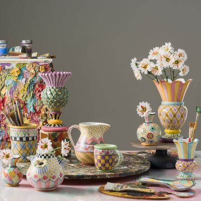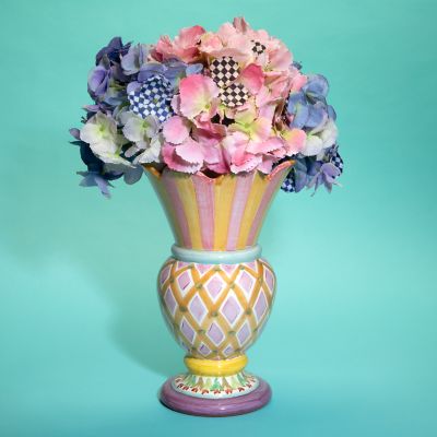Great lines. Great gift. Our handcrafted ceramic Odd Fellows Taylor Great Vase—featuring a patchwork of patterns delightfully mix-matched—is hand-painted in a carnival of colors here in Aurora, New York. Turn it over and you’ll see the stamps of each of the artisans who had a hand in its creation. Generously sized for an impressive presentation.