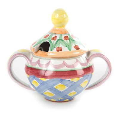 Dating to the early days of MacKenzie-Childs, our Taylor patterns are something special from our ceramic archives. Each pattern features various combinations of playful dots, squiggles, stripes, and florals in a rainbow of colors hand-painted on majolica. The patterns, which are designed for mixing and matching, were named for significant places in the lives of the company’s founders and local spots around the MacKenzie-Childs studios in Aurora, New York.