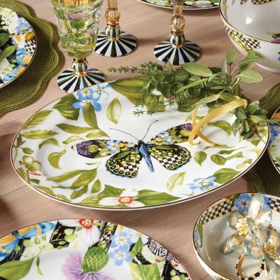 There’s been quite a buzz about our new take on formal servingware. Handcrafted in Portugal, the Thistle & Bee Serving Platter is trimmed in gold lustre and features a verdant decaled suite of early-spring wildflowers and a butterfly with wings draped in classic MacKenzie-Childs patterns. An ideal treat for the bride who delights in life’s little pleasures or the hostess who orchestrates the most charmed evenings.