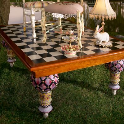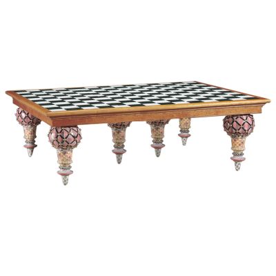 The modern notion of a locomotive might seem an unlikely source of inspiration, but our 5′ x 15’6″ Train Table recalls the opulence of an era when travel by rail was the height of style. The striking top of vinyl tile is sealed with lacquer and trimmed with a cherry molding, border, and apron. And most magnificent of all are the four handmade, hand-glazed, and hand-painted ceramic legs decorated with floral transfers, gold lustre embellishments, and brass buttons. Station this legendary piece in your home and board the express train to the grandeur of a bygone era.