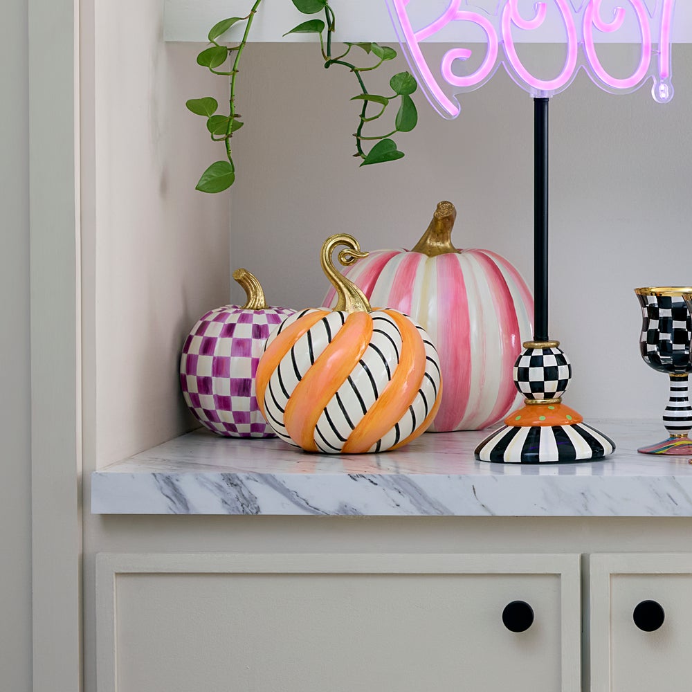 Take your pick from our most unusual pumpkin patch with a medium orange pumpkin, accented with black swirls on white and trimmed with a gold leaf stem.