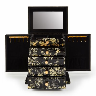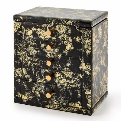 This jewelry armoire is a fabulous and functional piece, with four working drawers that have a variety of storage options, including sides that open to hold necklaces and a mirror inside the lid. It’s decorated with a black and gold version of our iconic Flower Market pattern printed on glass, finished with beveled edges.