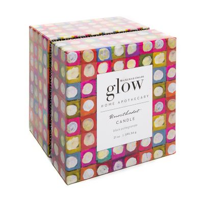 MacKenzie-Childs Glow Home Apothecary defines the essence of home with fresh and inviting scents. Be enlightened by our 21-ounce Unorthodot Candle, which is a blend of palm and paraffin waxes with the scent of fruity black pomegranate with a woody finish. This candle, which burns up to 66 hours, is presented in a checked glass vessel that comes with a metal lid to preserve the scent when it is not burning.