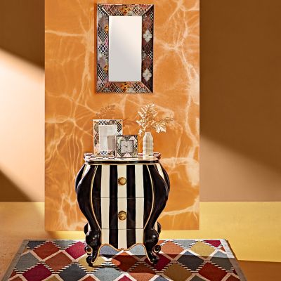 The Venezia Clock is small on size and big on style. Featuring a patchwork of iridescent patterns printed on mirrored glass finished with beveled edges, this eye-catching piece gives new meaning to “watching the clock.”