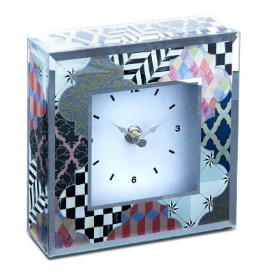 The Venezia Clock is small on size and big on style. Featuring a patchwork of iridescent patterns printed on mirrored glass finished with beveled edges, this eye-catching piece gives new meaning to “watching the clock.”