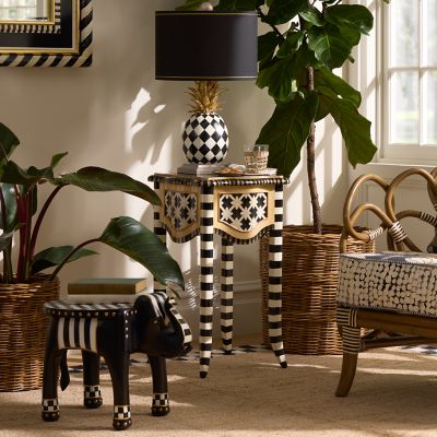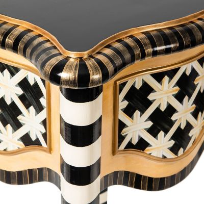 This accent table, made of beechwood with a hand-applied, multilayer finish, features a porcelain top with classic marble veining that is stain- and heat-resistant. A hidden drawer, lined with Courtly Stripe, offers more storage options. Additional hand-painted Courtly Check® and Courtly Stripe are added to the apron and the legs by our Aurora artisans.