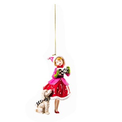 Trim the tree with an ornament featuring a retro-style girl, dressed in pink and red, holding a Courtly Check® songbook, with a poodle at her heels.