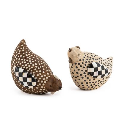 Set includes: one tan chicken (5.25"long, 3.25"wide, 3.75" tall), one brown chicken (5" long, 3.5" wide, 4.25" tall)